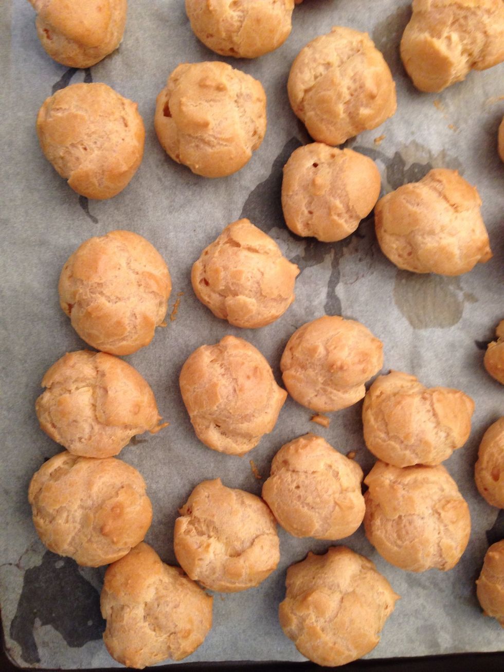 Form the mini choux. Simply spoon the dough on the tray. Bake at 200C 15 mins then lower the temp to 180C and leave them for another 20 mins or so.