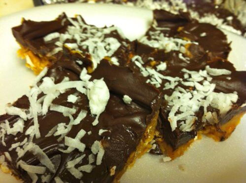 Crush pretzels in food processor (or with your hands. Whatever).