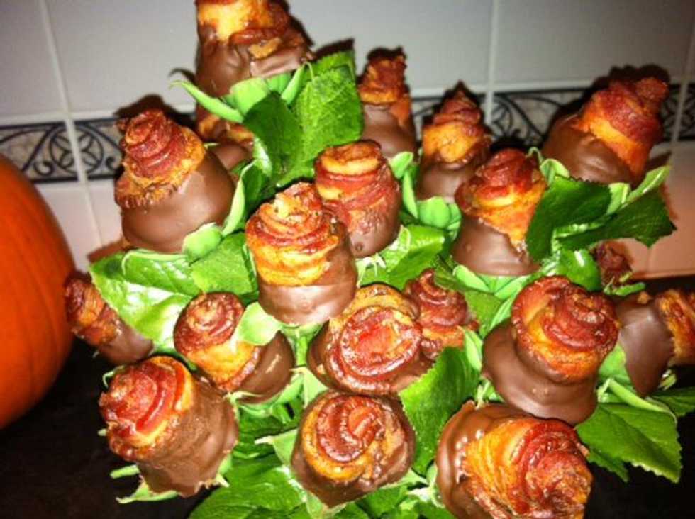 If you get roses then remove the petals and you'll end up with a nice stem for your awesome roses. Put the bacon roses through whatever stick you decide to use and feel free to devour the beauties.