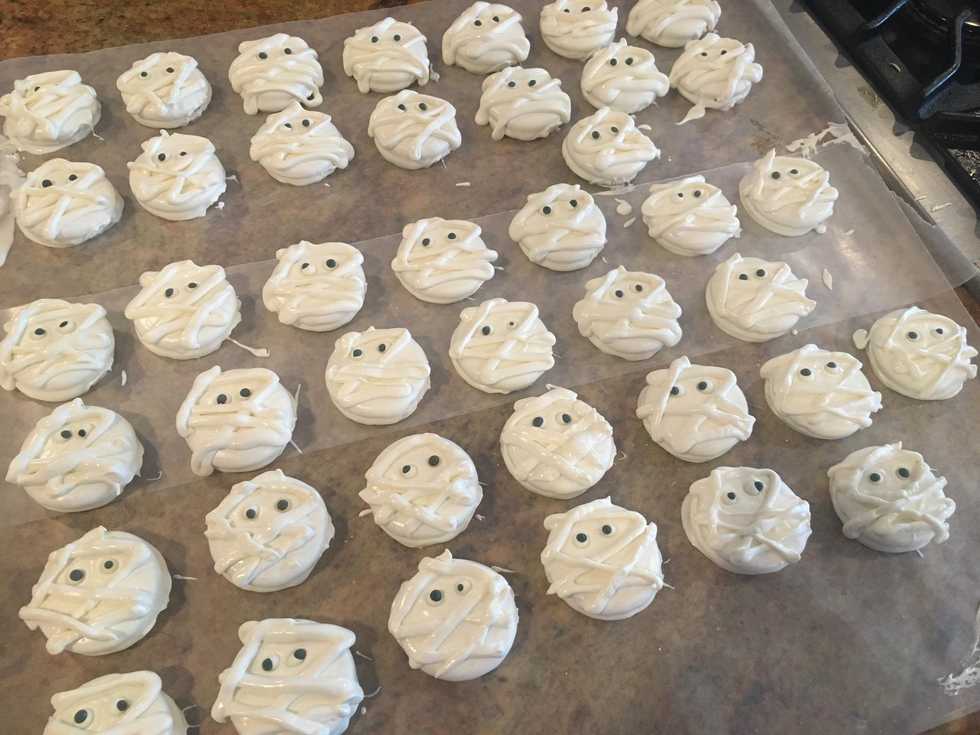 After all oreos are dipped and have eyes, put the remaining melted chocolate in a plastic bag and cut the tip of the bag. Drizzle the chocolate across the oreo to make it look like a mummy bandage.