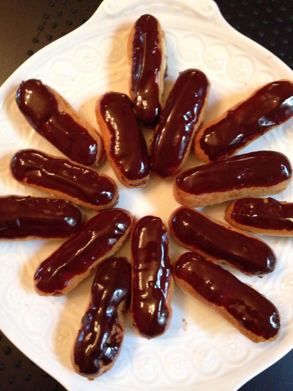 Fill with pastry cream https://snapguide.com/guides/make-pastry-cream-a-french-classic. For chocolate pastry cream, add 160 g of chocolate 70% cacao dip in the glaze. Refrigerate untill glaze set.