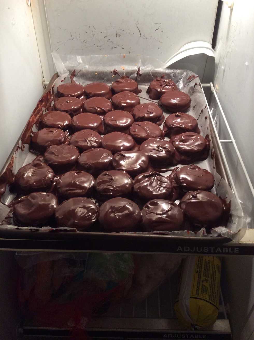 Pour melted chocolate over the Oreo cookies.