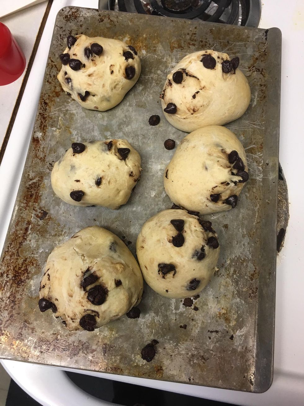 After the dough has risen, spray baking sheet with nonstick spray or wipe oil on sheet, then start shaping the dough into little balls and place them on the baking sheet about 1 inch apart
