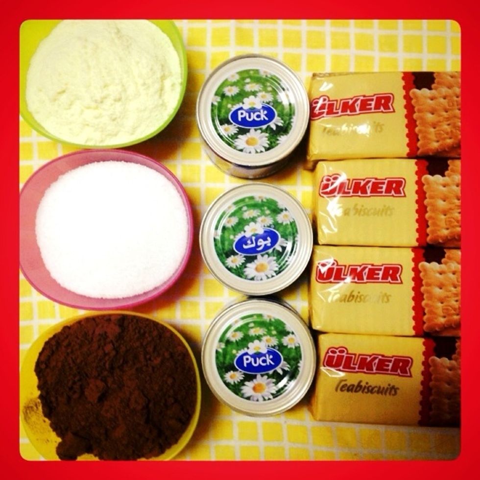 If you want small amount of the mixture use 4 tablespoons of milk, 4 tablespoons of sugar and 4 tablespoons of cocoa, A can of cream and half a pack of biscuits.