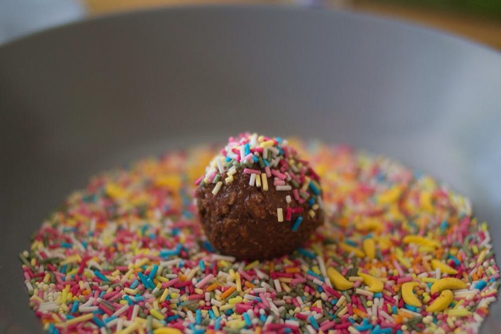 Finaly, make plum sized balls of the chocolate dough and roll it in whatever sprinkles you want (in Sweden it's common to roll them in coconut). Store in the fridge or freezer. FINISHED!