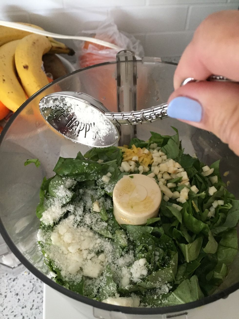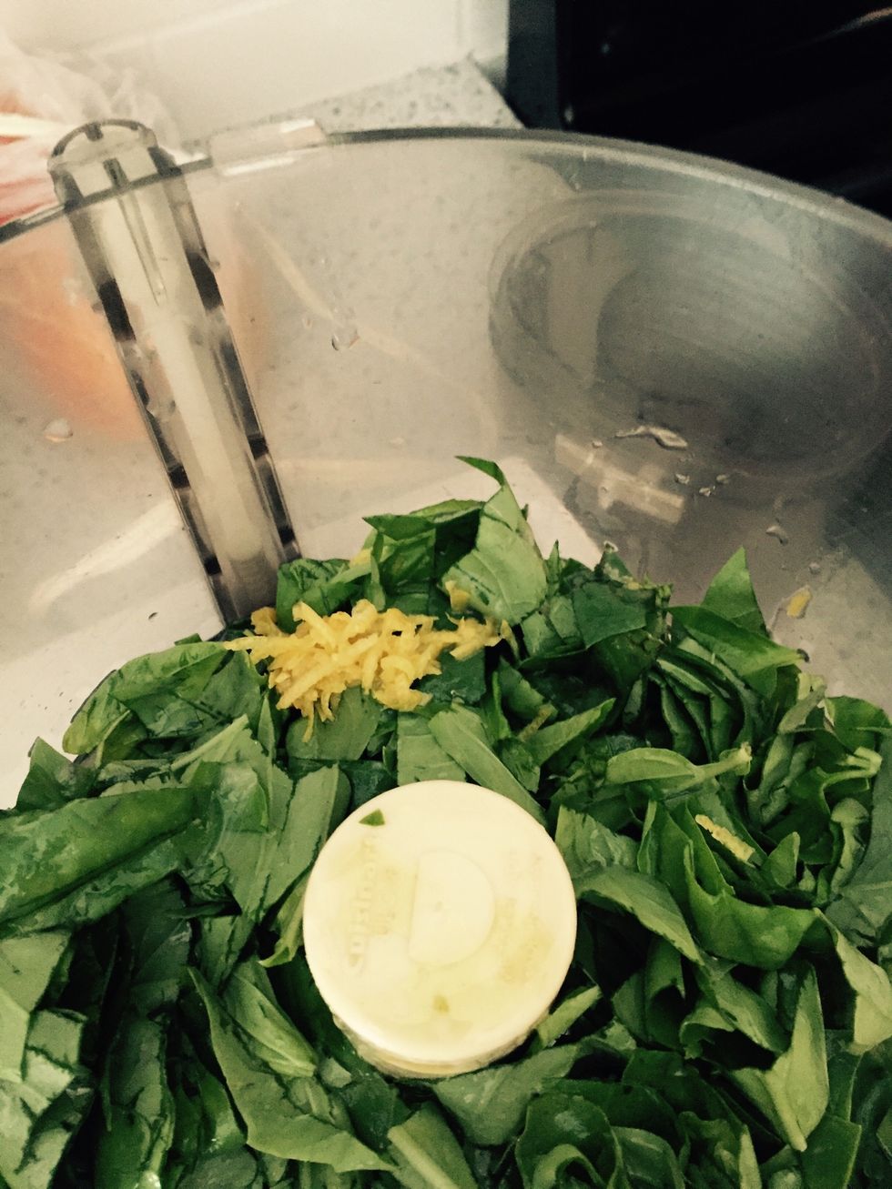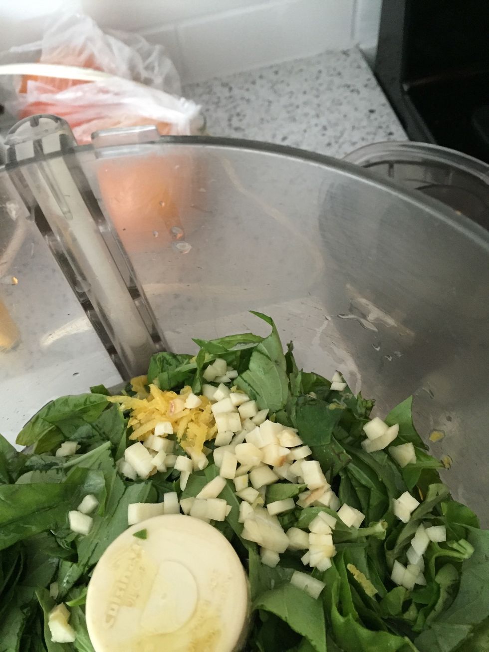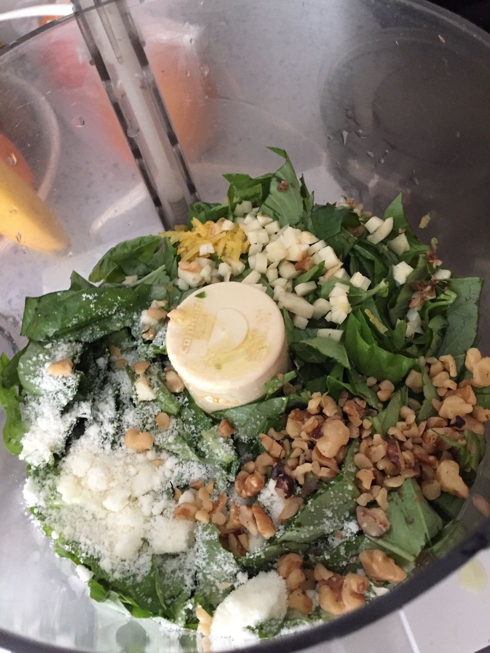 Put 2 cups of fresh basil leaves in food processor with steel blade.