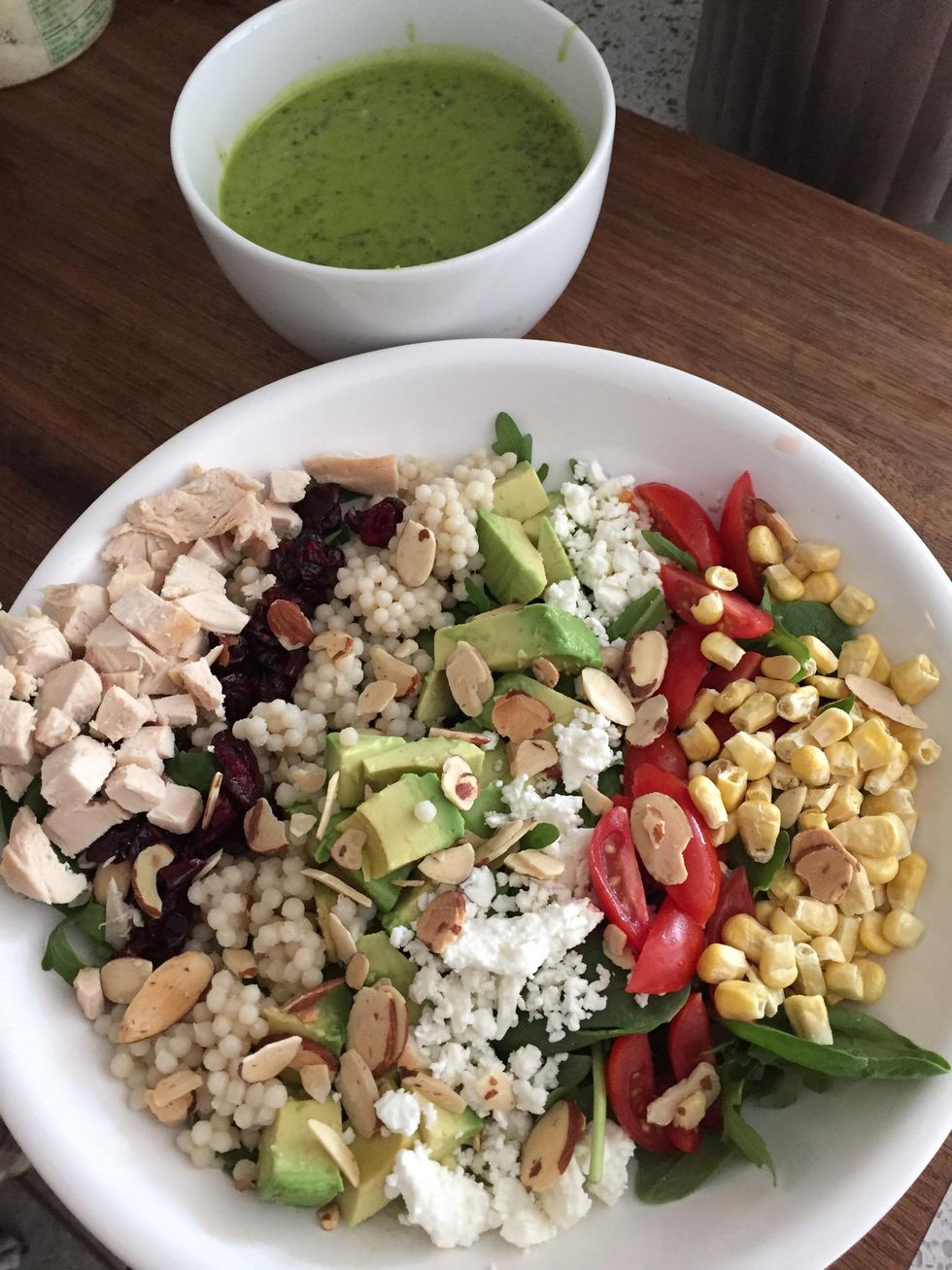 Add chosen ingredients: cooked, sliced chicken breast, dried cranberries, pearl couscous, avocado, feta cheese, tomato, and freeze-dried corn. Enjoy!