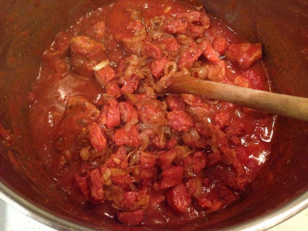 Add the chorizos and shallots to the pot with the pork. Stir.