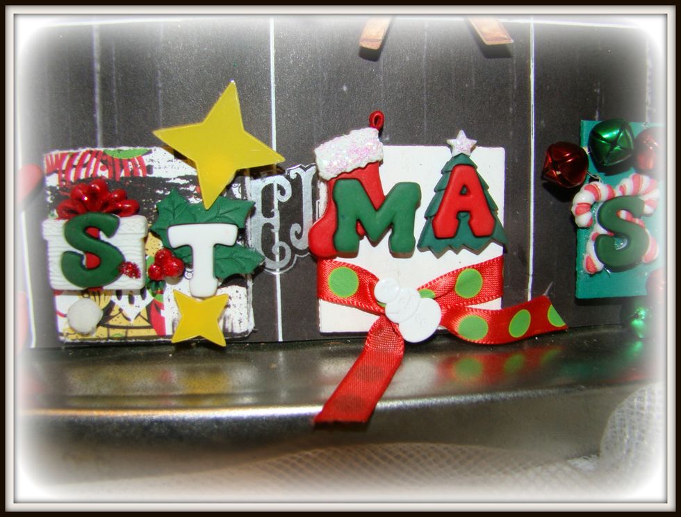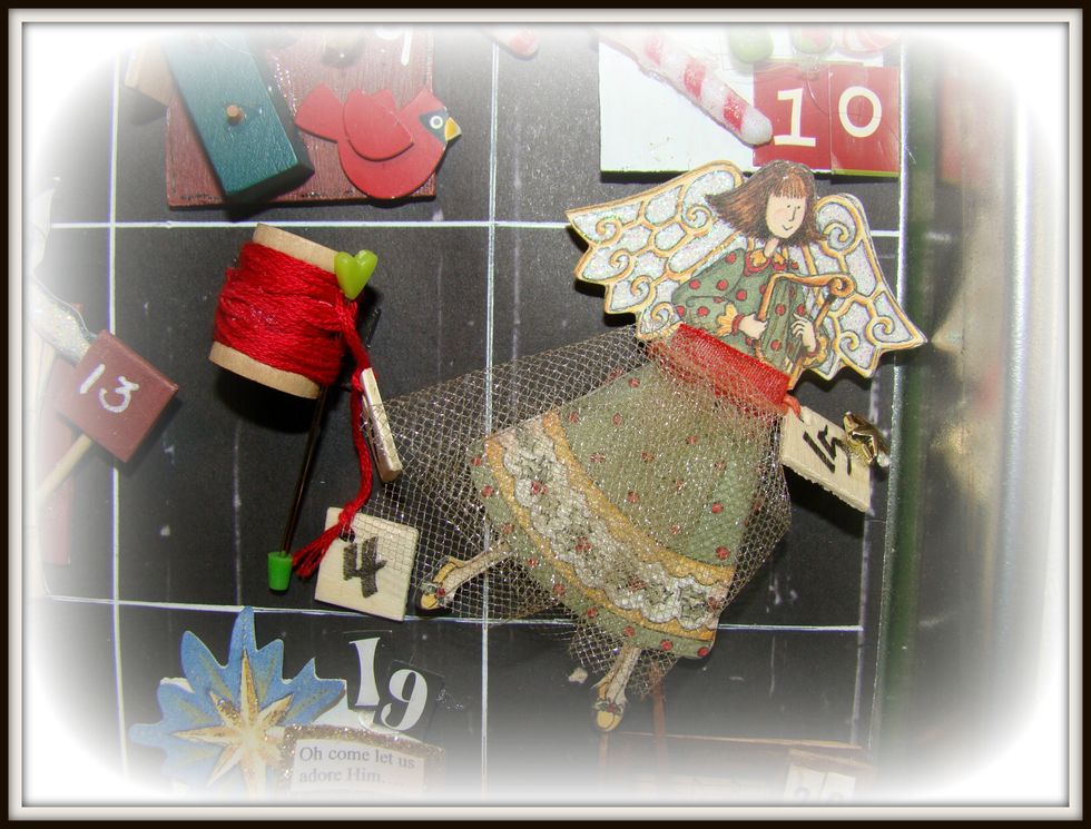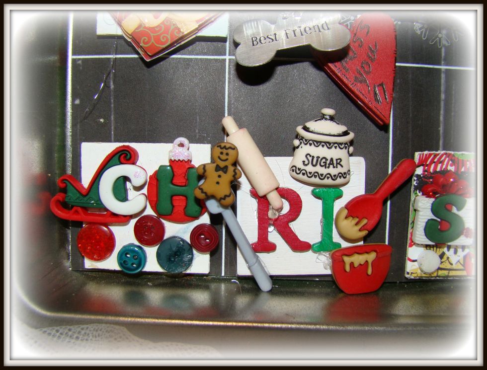 Using chalkboard paint I covered the remaining portion of the cookie sheet. Using a white pen I drew out the grid lines. I randomly applied chalkboard Christmas rub ons here and there.