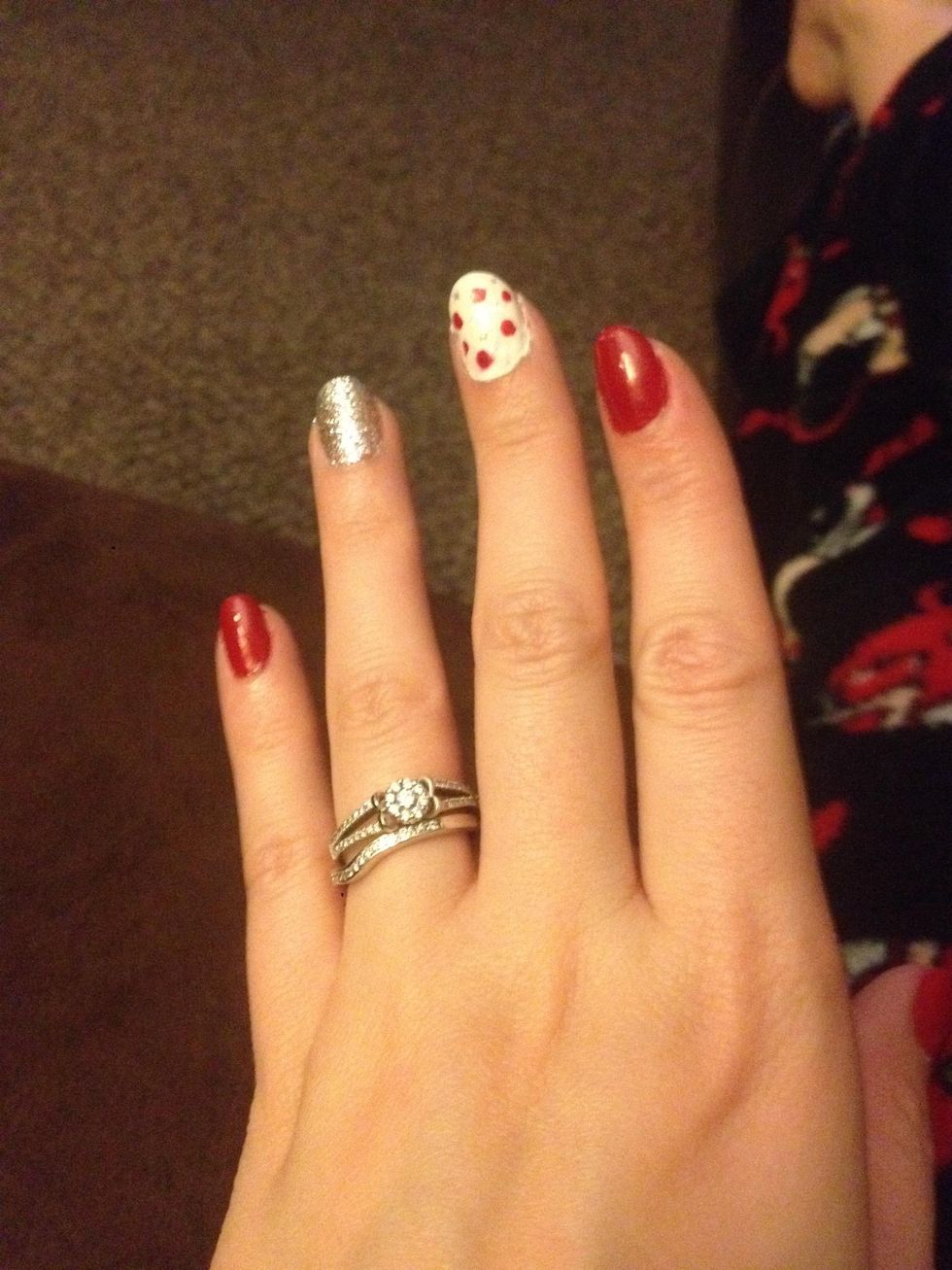 Finally, take a dotting tool and make red and silver polka dots on your white painted nail!