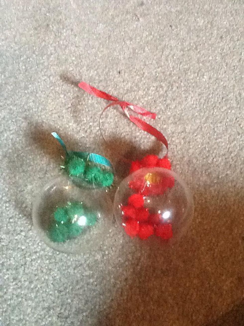 Put red and green pom poms inside of clear ornamentsUse hot glue gun to glue the red and green pom poms around the clear ornamentsTie red or green strings to hanging your Christmas ornaments! All done!