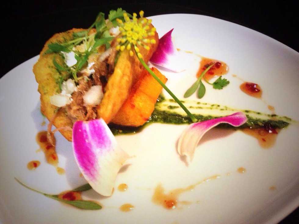 Fill the tortillas with the pork and finish with your favorite toppings & garnishes. I chose onions, diced tomatoes, honeysuckle petals, queso fresco, and cilantro!!! PLATE IT AND ENJOY!!