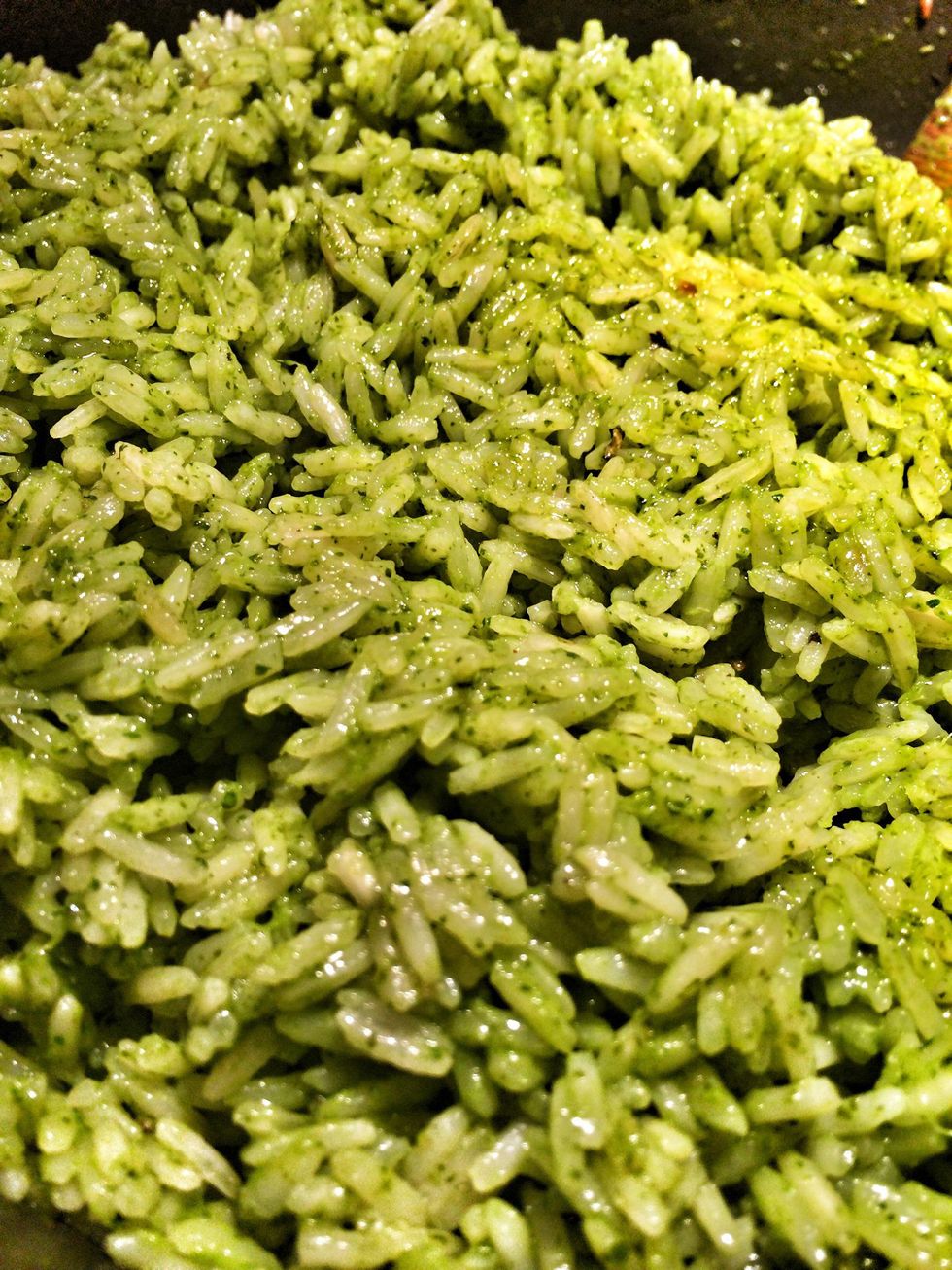 Pour the cilantro sauce over the rice. Start with half and add more depending on to taste.