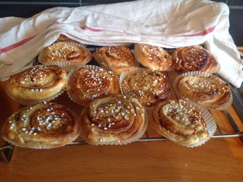 Lägg bullarna på ett galler och ta en kökshandduk och lägg över, Sen är du färdig. Put the buns on a rack and grab a kitchen towel and place over, then you're ready.