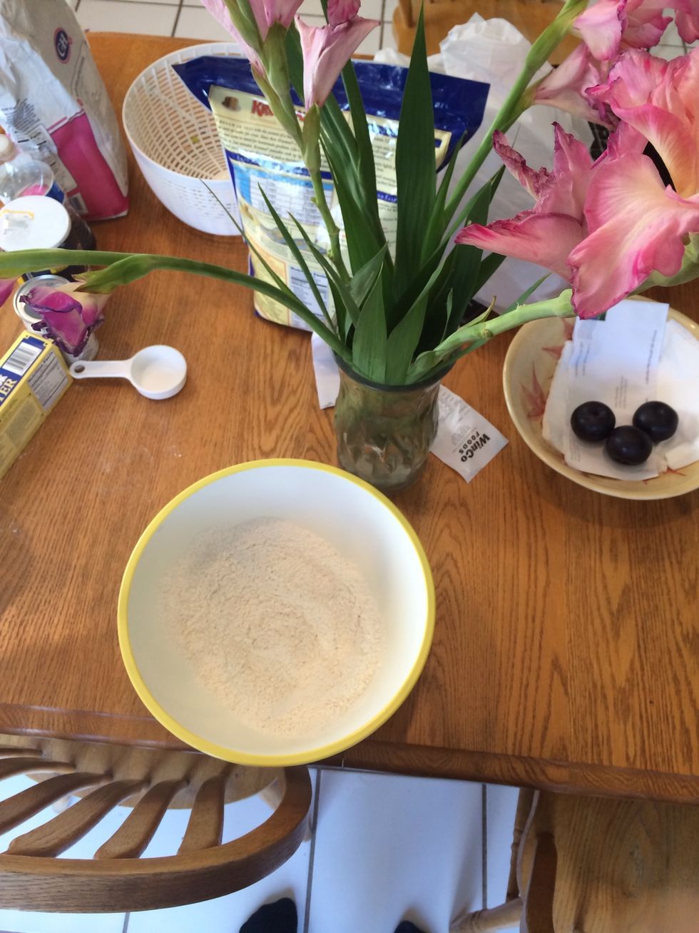 1. In a large bowl, mix together flour, salt, baking powder, and sugar; set aside
