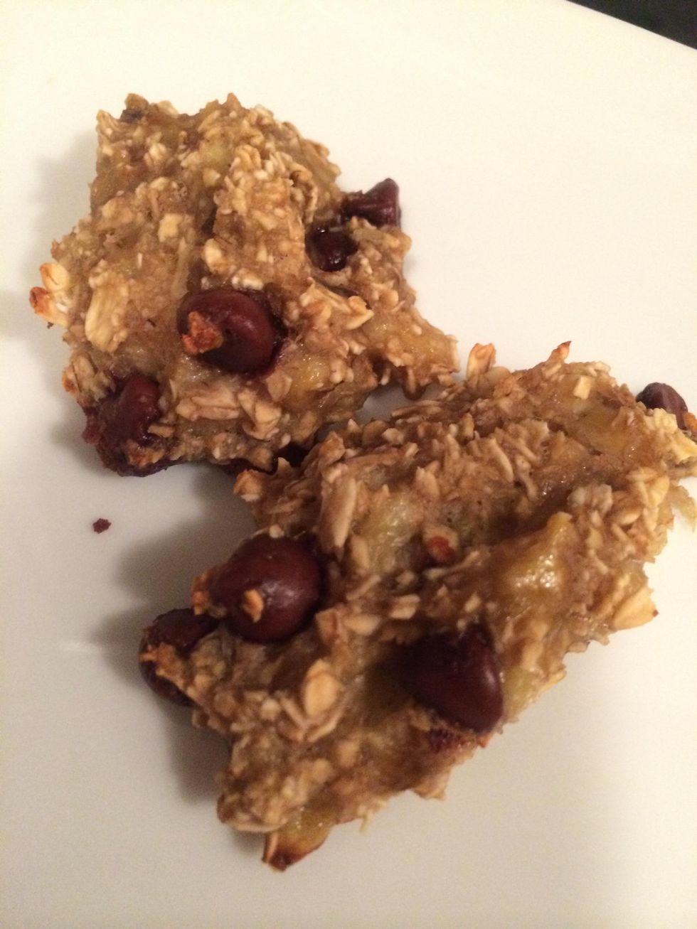 Preheat oven to 350I'm using gluten free rolled oats, so I'm making them a bit thinnerMash two bananasMix to bananas the oats, 1 cupMixAdd your chips, 2 tablespoonsMix wellCook for 20 minsCoolMakes 16, 45 cal cookies