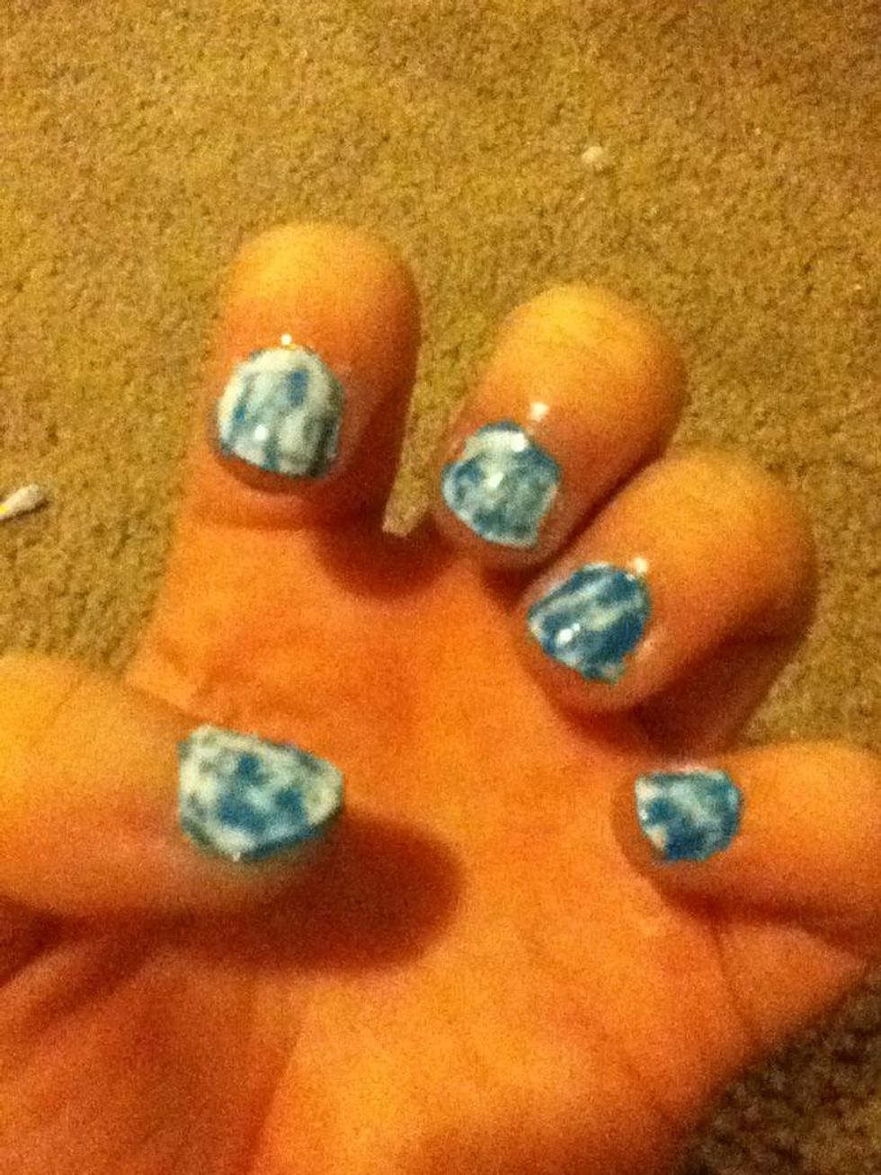 Dip a Q tip in nail polish, then gently dab at the white nail polish until the blue starts to show. Continue to your liking of how much blue you want.