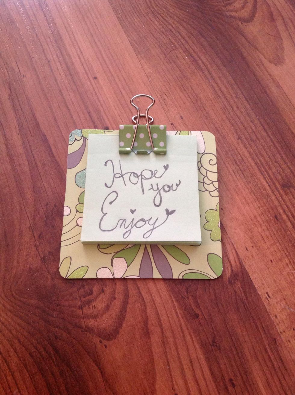 Add your clip and some paper. You could modify and add anything!! It's super simple and at craft shows I've seen these for like 6 bucks. Just go out and have drinks, then keep the coasters. Much Love!