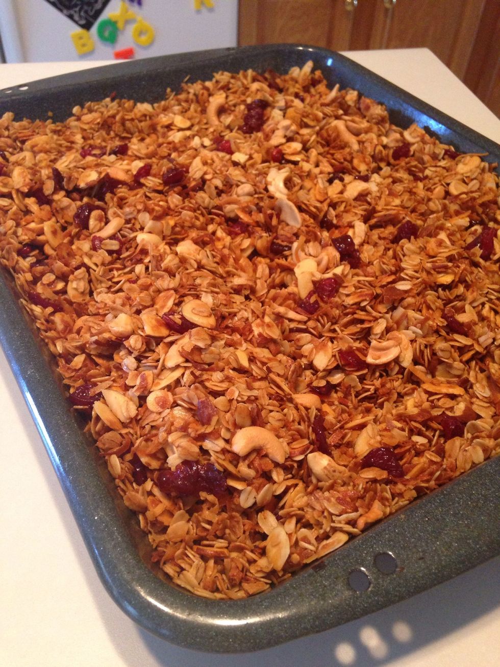 After 45 minutes, your granola looks like this! Remove from oven and stir occasionally as granola cools and hardens.