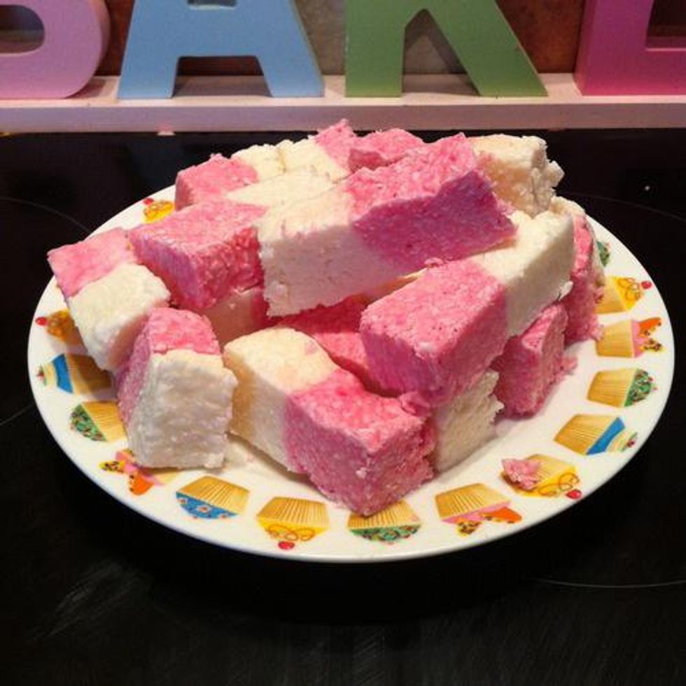 Then pop this in the fridge and leave to set for 2-3 hours. For best results, leave overnight. Cut the edges off (and eat them.) And then cut your coconut ice into lovely little slices!