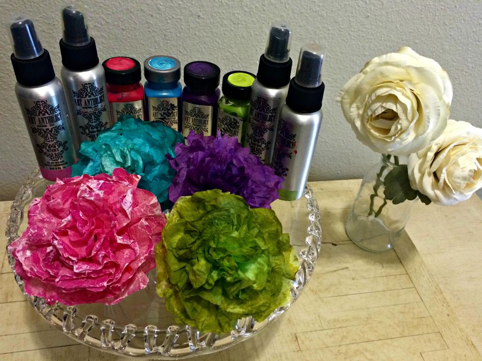 Mix 2 tsp of paint with 1/2 C water and add coffee filters. Separate them and smash them in there...let them soak for 2 hours then one by one squeeze out the excess water and lay them flat to dry.