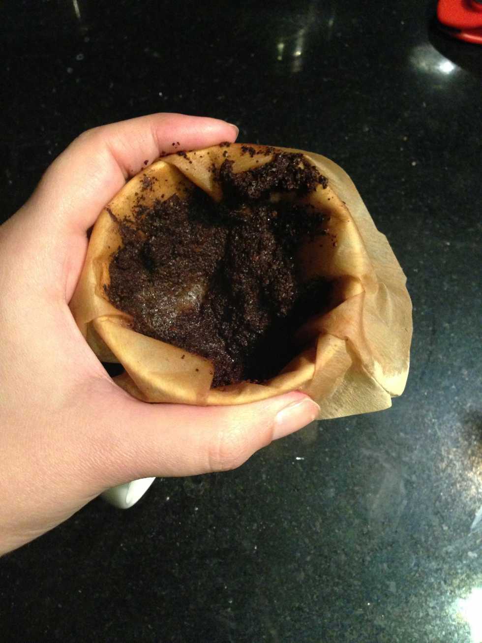 Poor freshly boiled water on top, at this point your filter may slip in, so carefully pull it out and wrap it around the mug with your hands in place