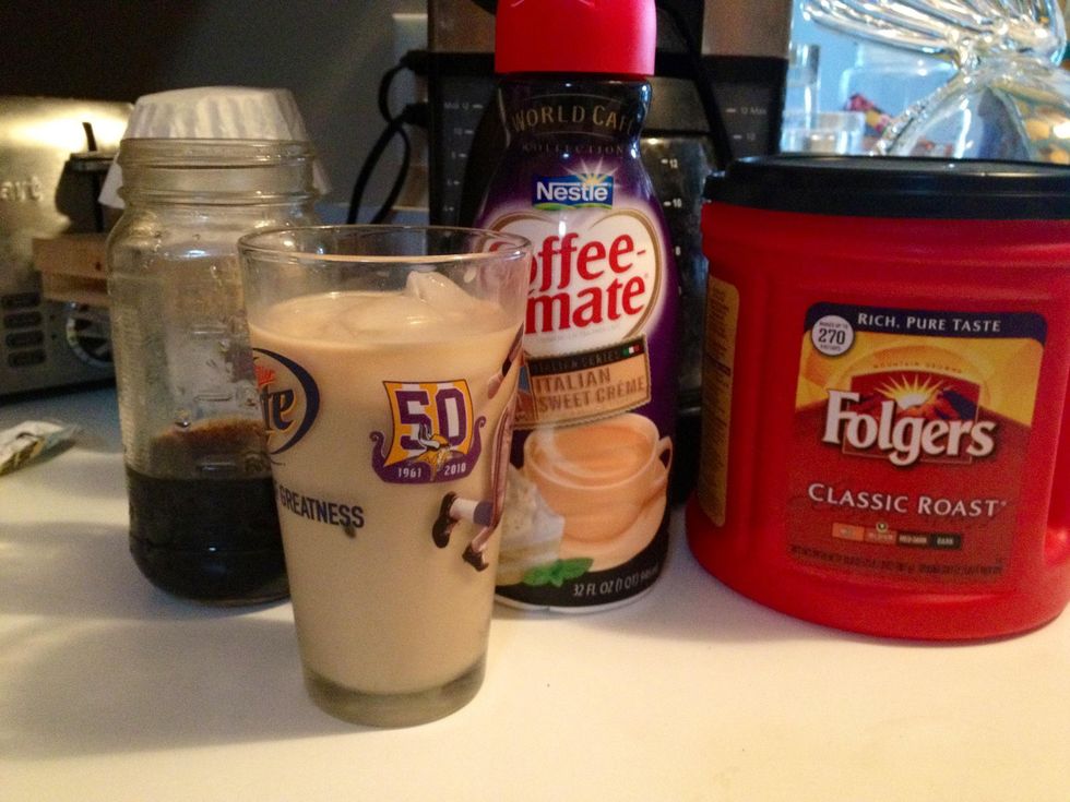 To use, mix with equal parts water/milk hot or not) as desired. I made my cup with ice cubes, milk, some water and a splash of creamer. ENJOY!