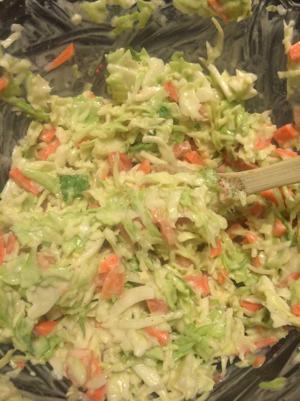 Shred cabbageCut carrotsChopped carrotsChop one tomatoAdd cabbage and veggies togetherOne tablespoon lemon juiceOne tablespoon vinegarMayonnaiseMixAdd a spoon full of sugarAdd a dash of salt and pepperIt should look like thisYummy
