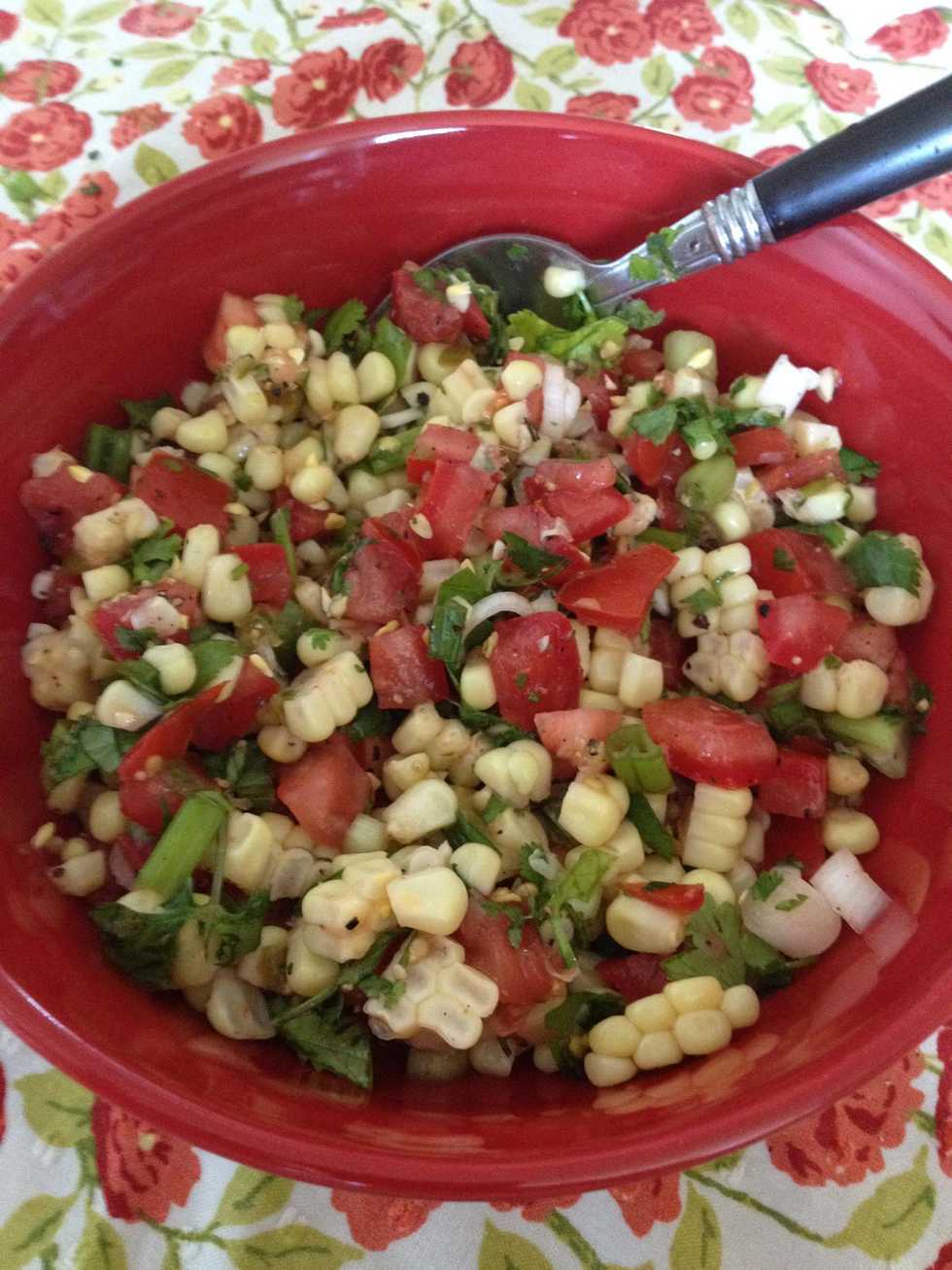 Next add the onion to the tomatoes and corn.