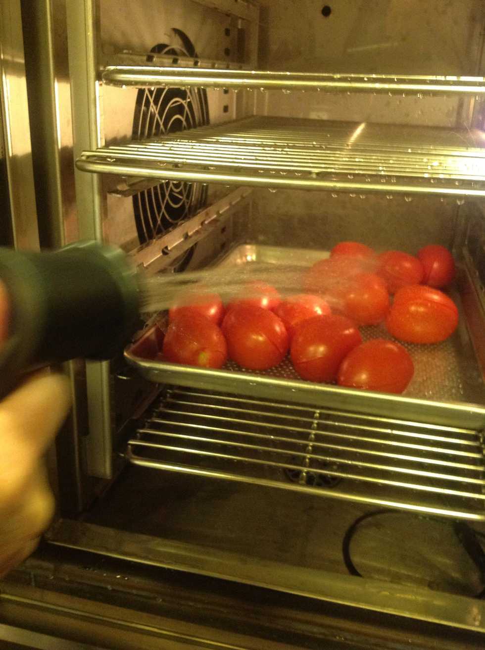 Score an X on the bottom of the tomato Remove the top On a per pan place in the combi Steam at 212F (100C). For 3 minutes Cool with spray hose Peel the skins Dice