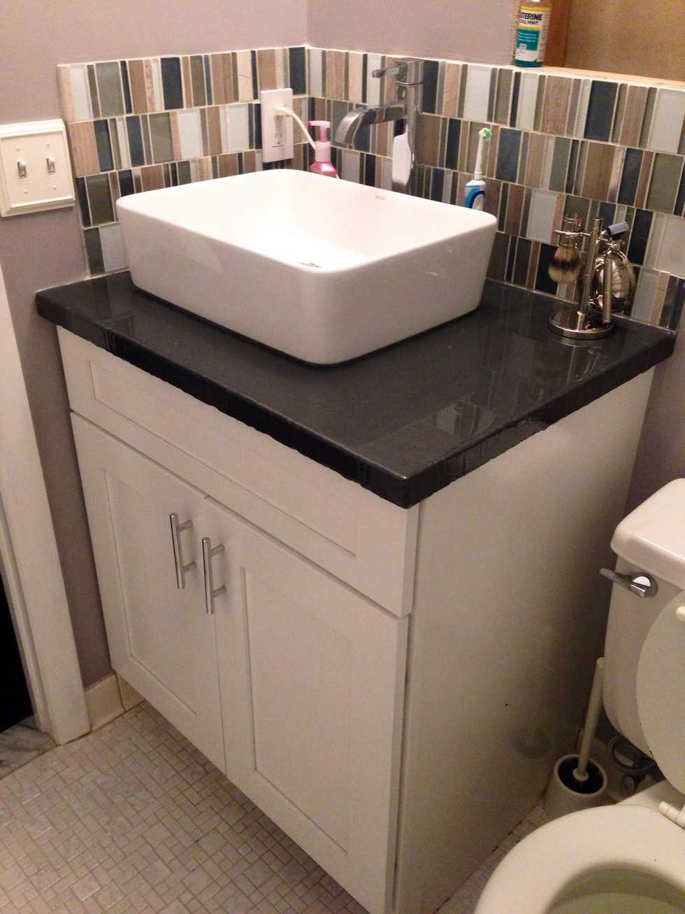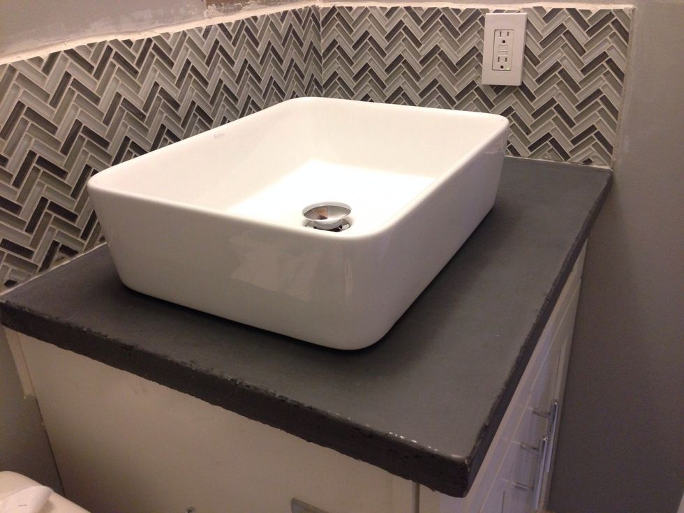 We used an adhesive the seal the edges before we added our backsplash tile. Then the sink!