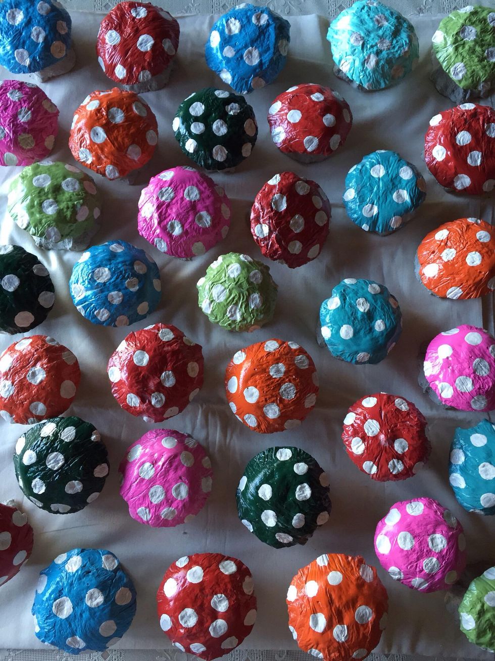 Paint your mushrooms whatever color you desire. I used acrylics and interior Behr household paint.