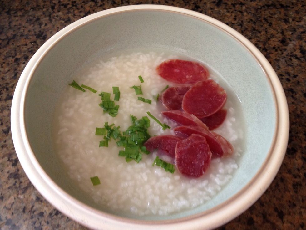 Add scallions and lup cheong to the finished congee. Bon appetit!