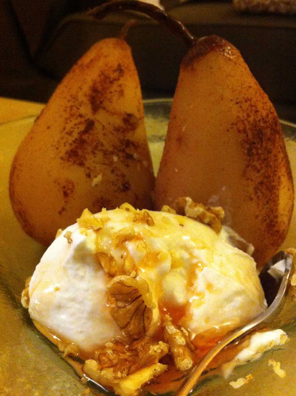 Place the pears on a plate (without juice), and add: cheese. Sprinkle over walnuts and honey.