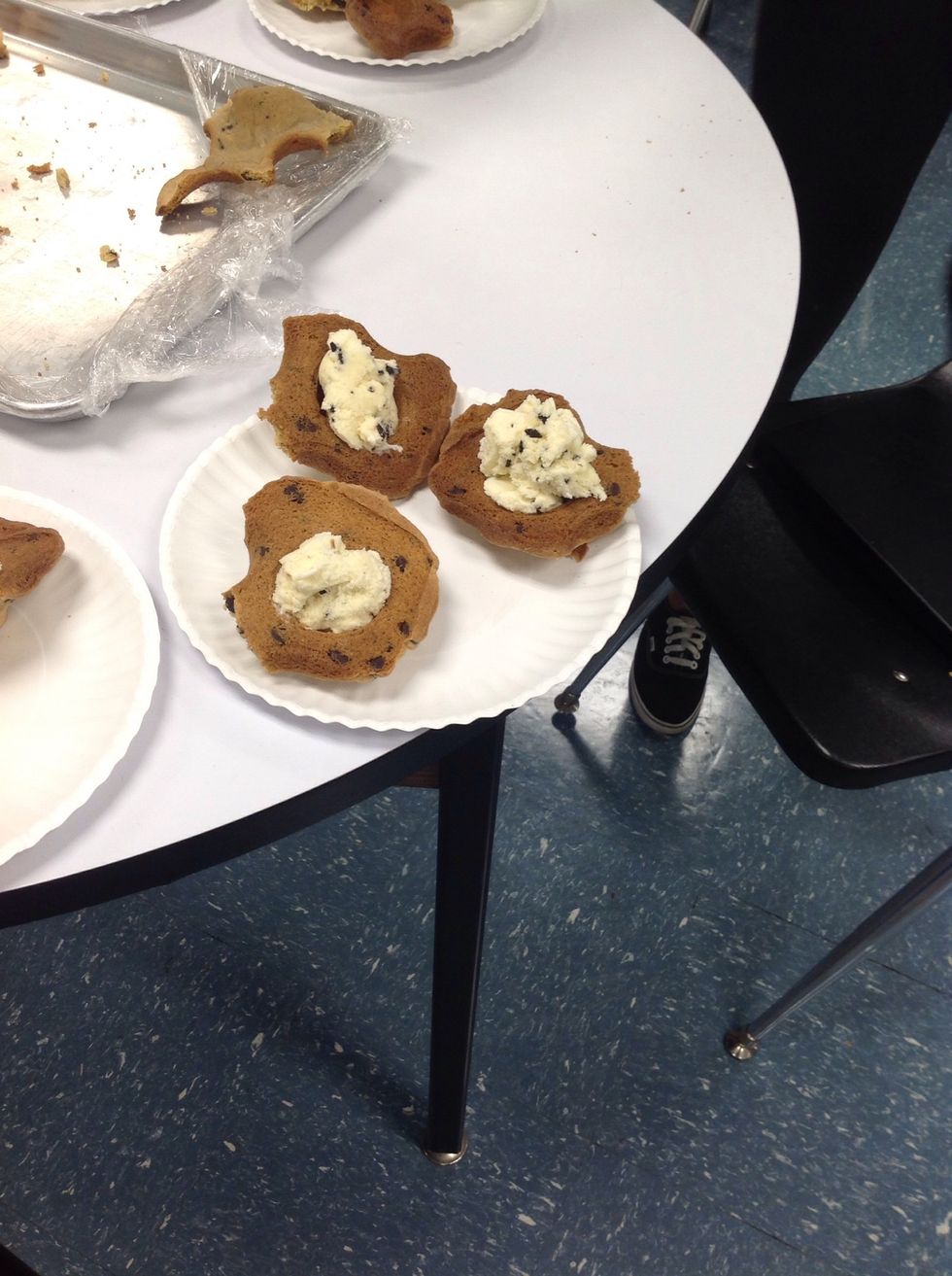 Do not use little muffin pan. And put eggs, baking soda and shorting in cookie dough recipe