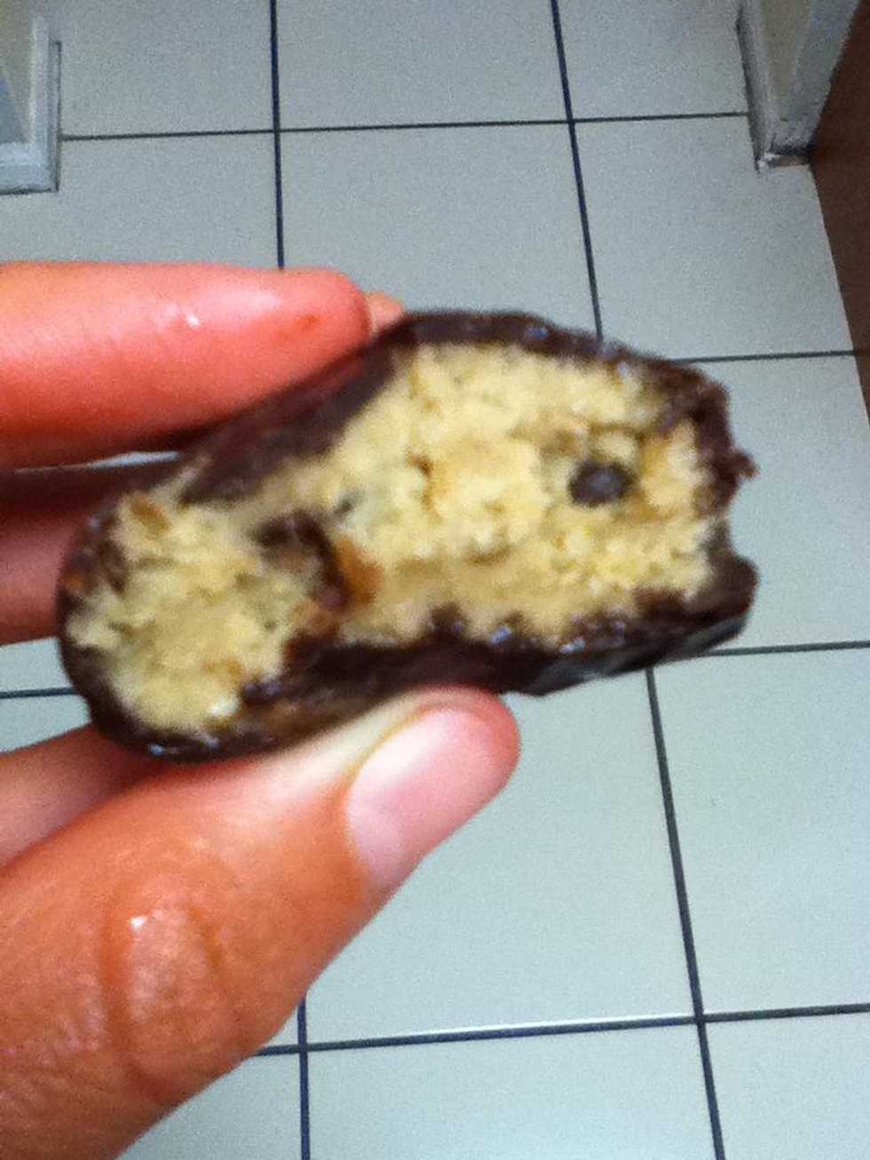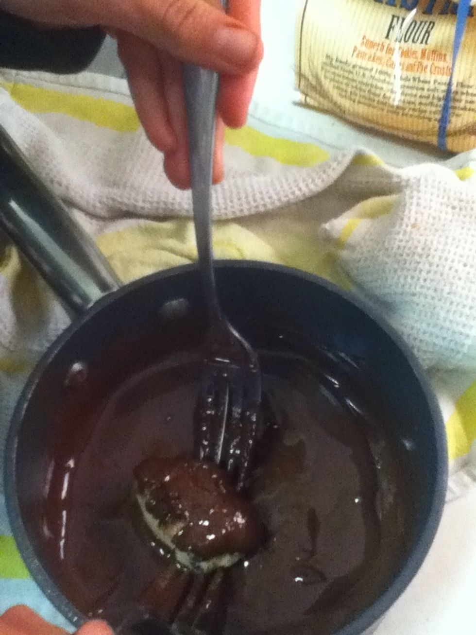 Using two forks, dip the eggs into the chocolate. Make sure the chocolate has cooled and the dough is cold. If it is melty, pop it back into the freezer for a few minutes.