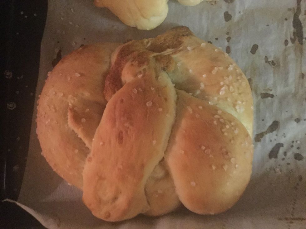 When the knots are done, dip them in a mixture of warm water(unspecified amount) and two teaspoons of baking soda. Then brush them in a beaten egg and sprinkle in seasoning(Course salt/Choice season).