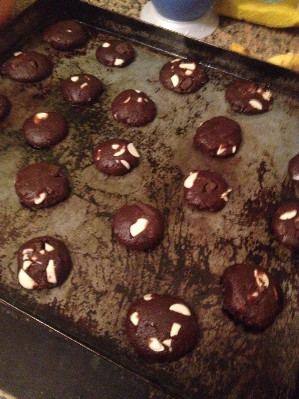 Break up all of your chocolate into it. Pop them into the oven for 11 minutes .When you get them out they will not look cooked but they'll be hard and overcooked once they are cool.