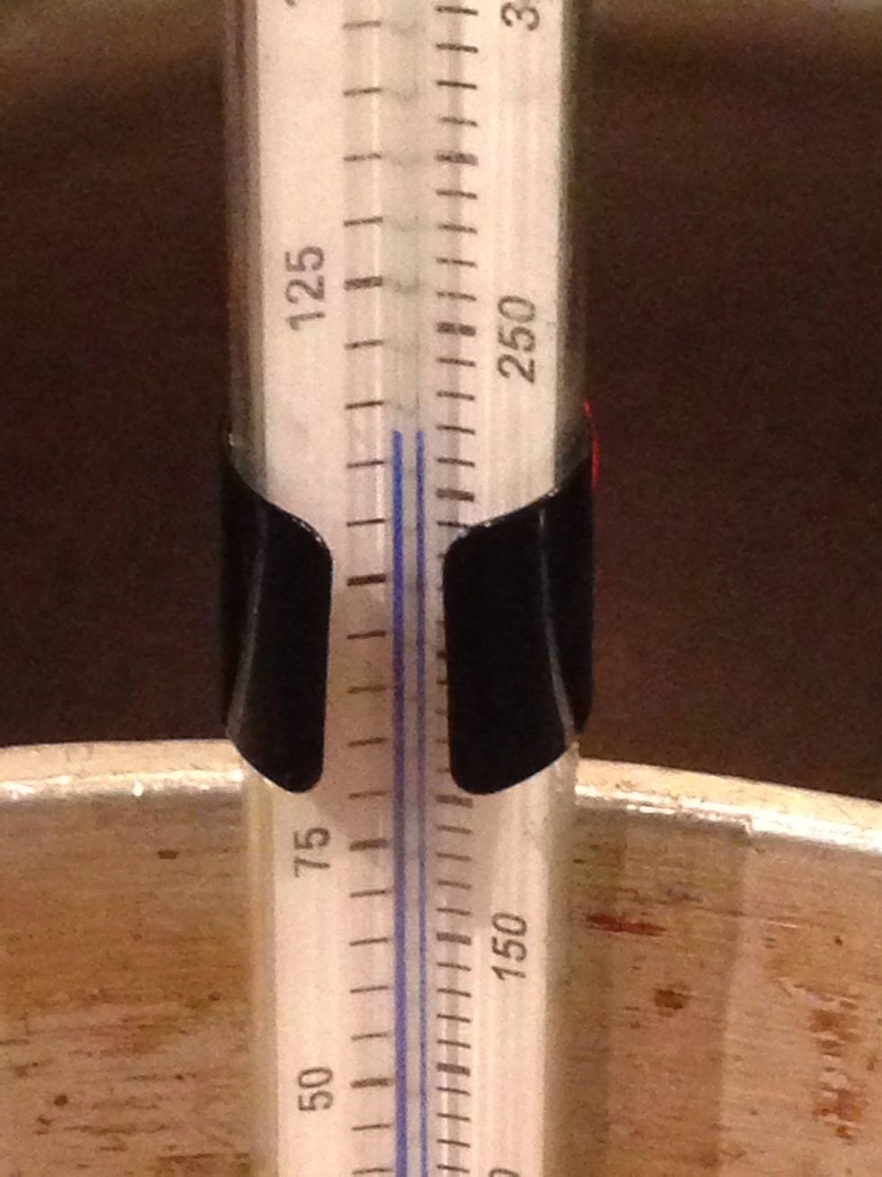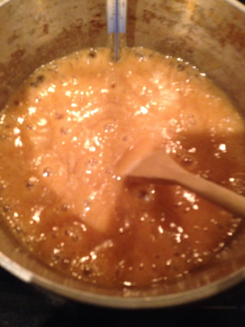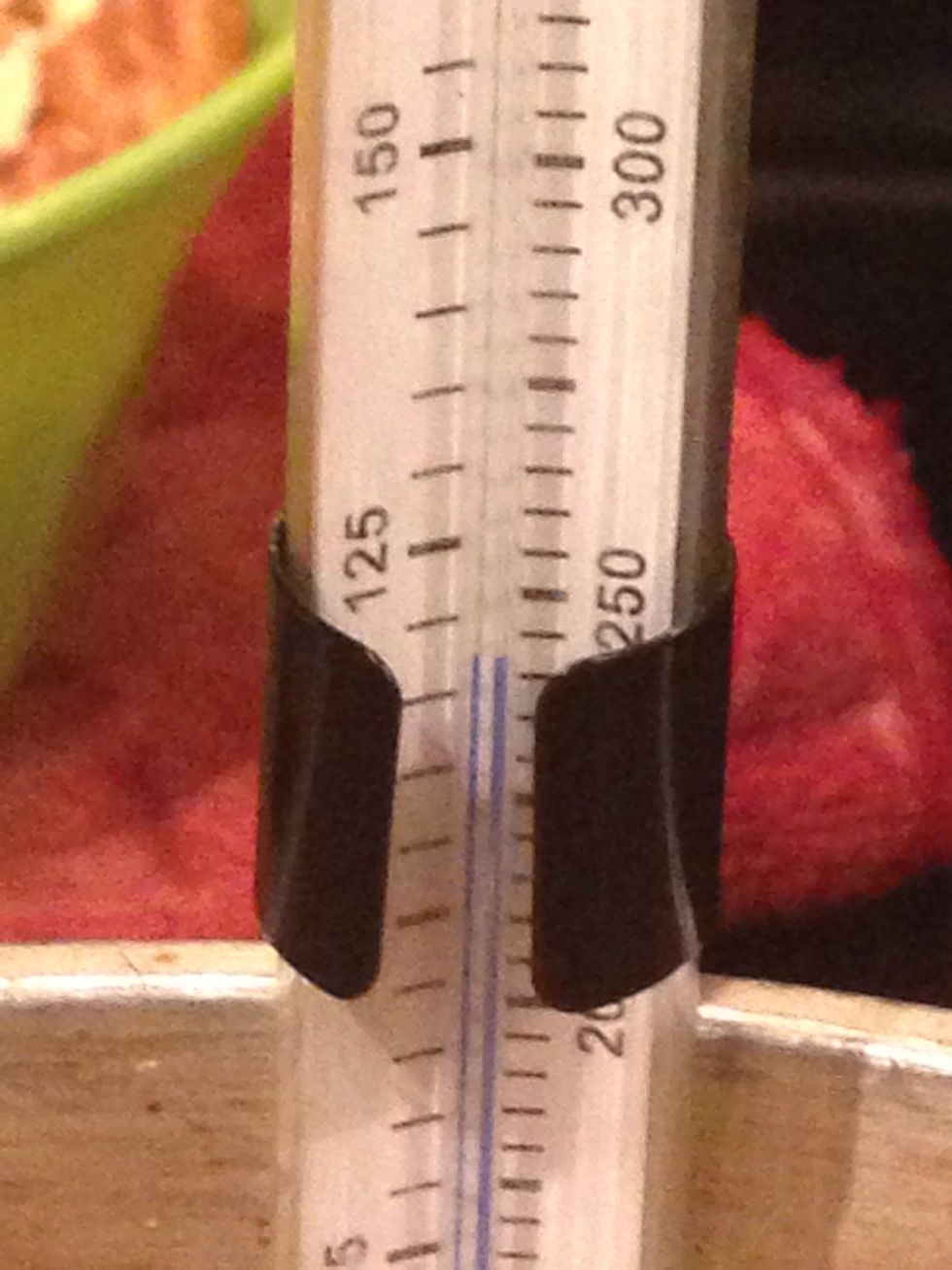 Put in your candy thermometer. Make sure the tip in not touch the bottom but is in the actual candy liquid. Other wise you would see how hot the pot is and not the candy.