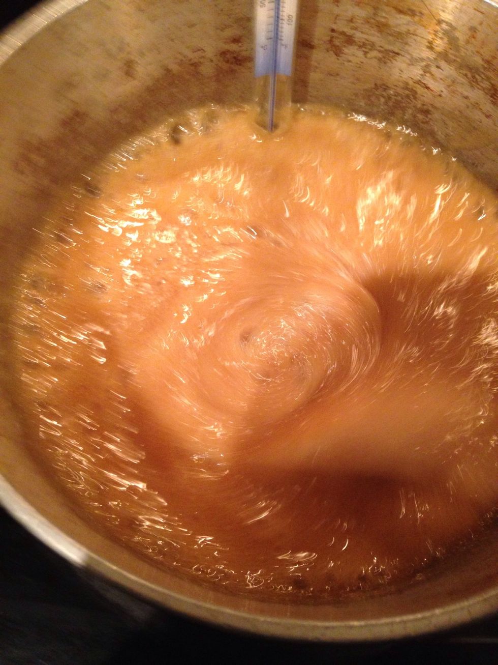 Cook the candy stiring occasionally until it reaches it's proper temperature: 240 degrees Fahrenheit.