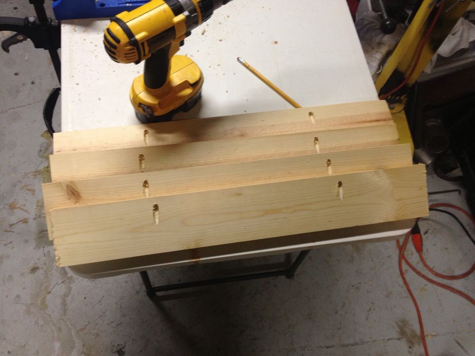 The two boards at the bottom have holes drilled on both sides because they will go in the middle of the 2 larger boards