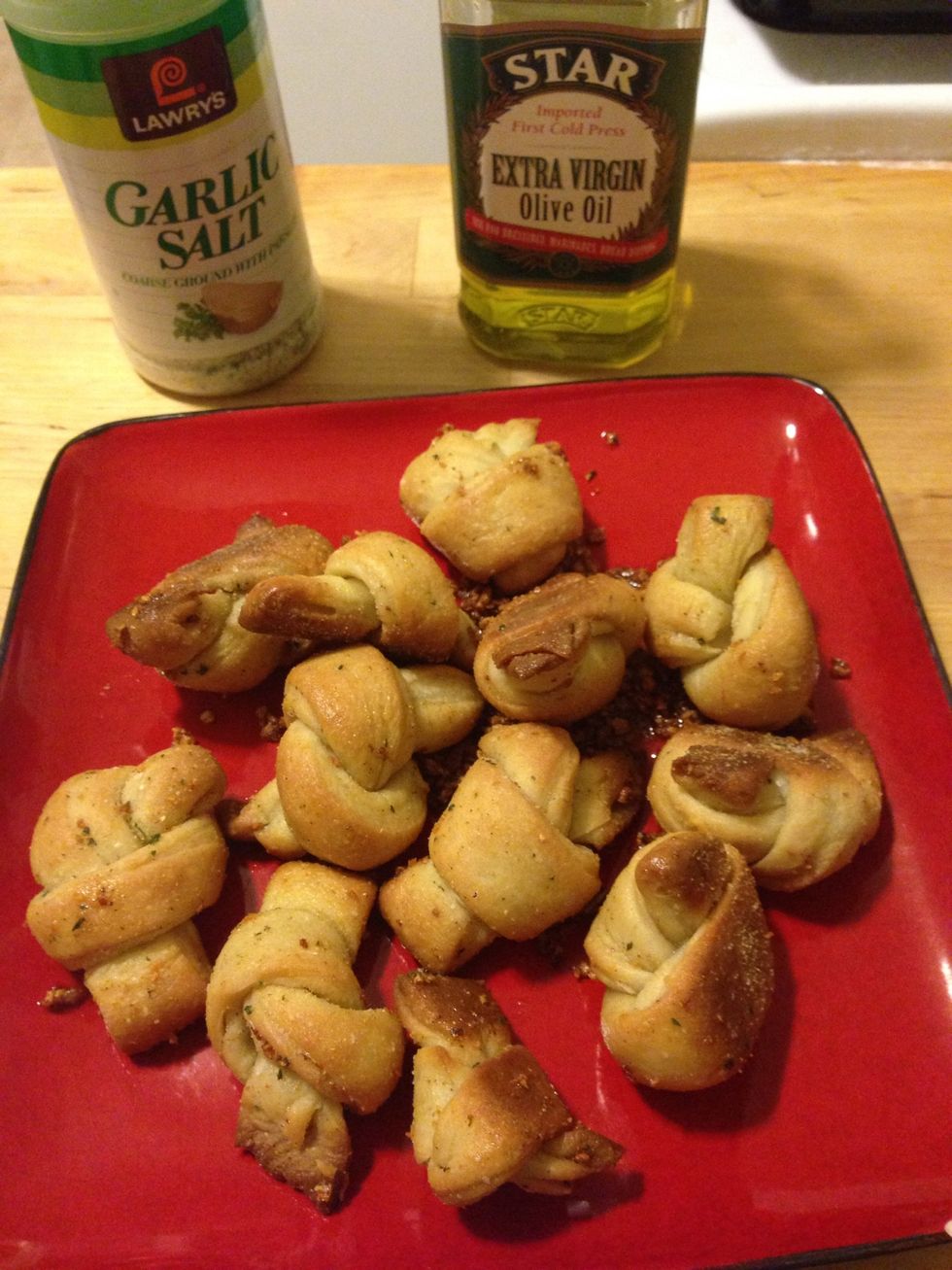 Mix the knots in the sauce. Let the rolls sit for at least 5 mins to absorb the olive oil. Add additional garlic salt if desired. I bet these also taste good with Parmesan cheese.