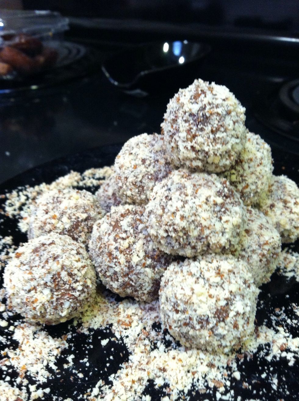 Roll the mixture into 3/4 inch diameter balls. Coat each ball in almond meal. Yields approximately one dozen balls.