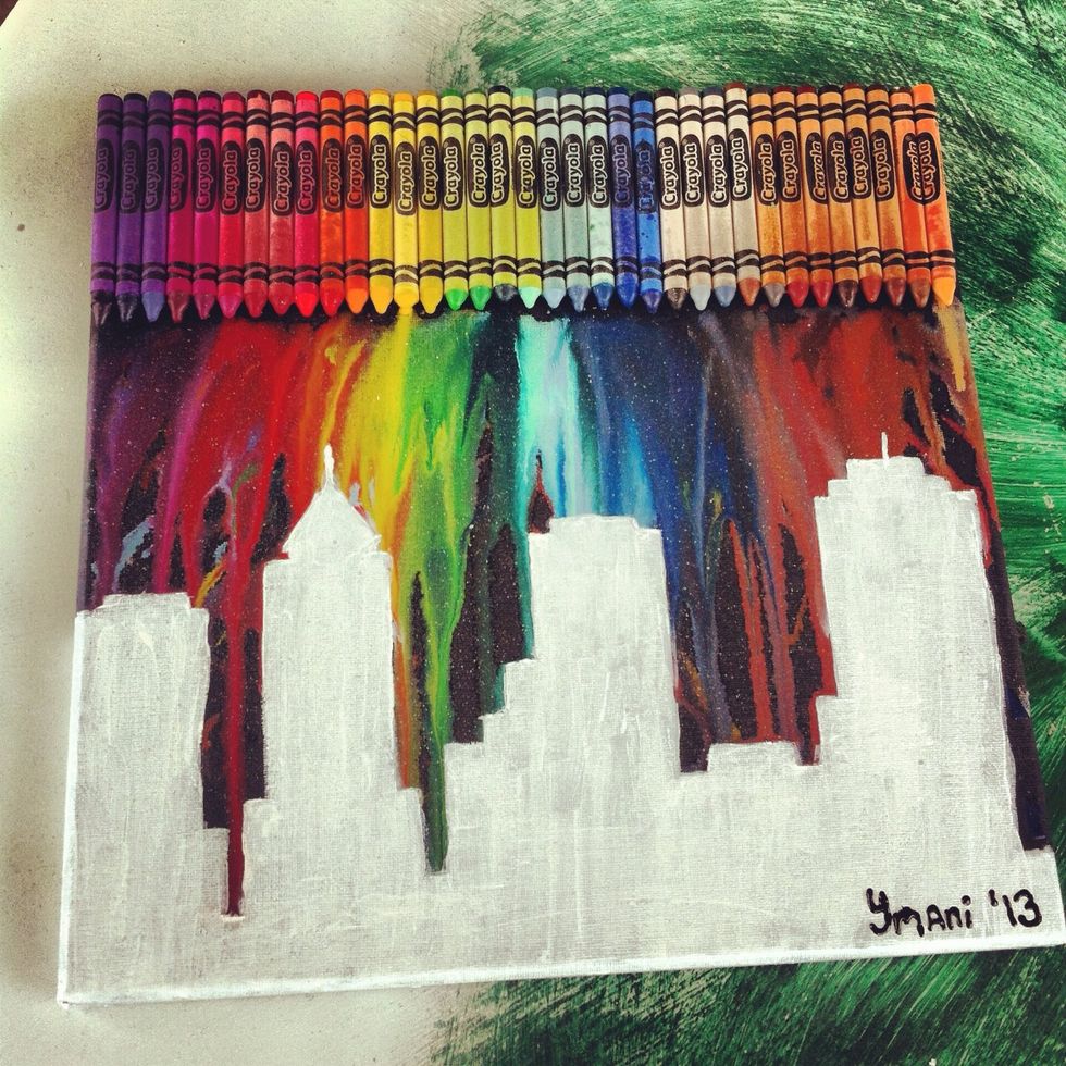 Glue the crayons in rainbow color order onto the canvas with a hot glue gun or crazy glue, I did a city skyline at the bottom with the painter's tape but you can definitely be creative with that part