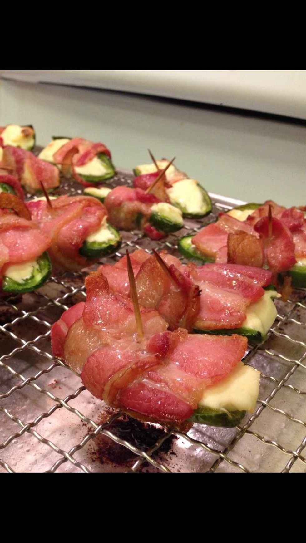 Place jalapeños on a grated sheet so the bacon fat can escape. Bake at 375 for 20-25 minutes.