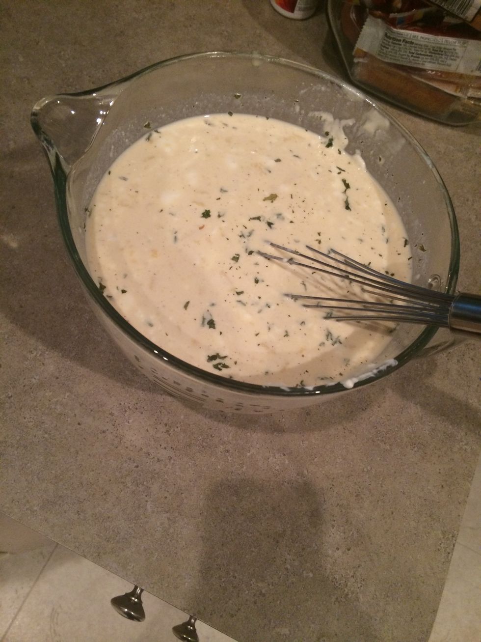Get out a large bowl and combine soup, sour cream, milk, parsley and pepper.