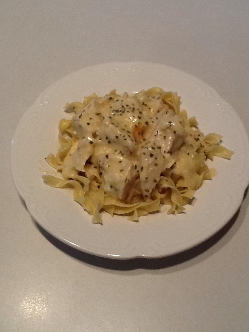 Place egg noodles on a plate. Layer with chicken, sauce from crockpot, and a little bit of basil. Serve and enjoy!