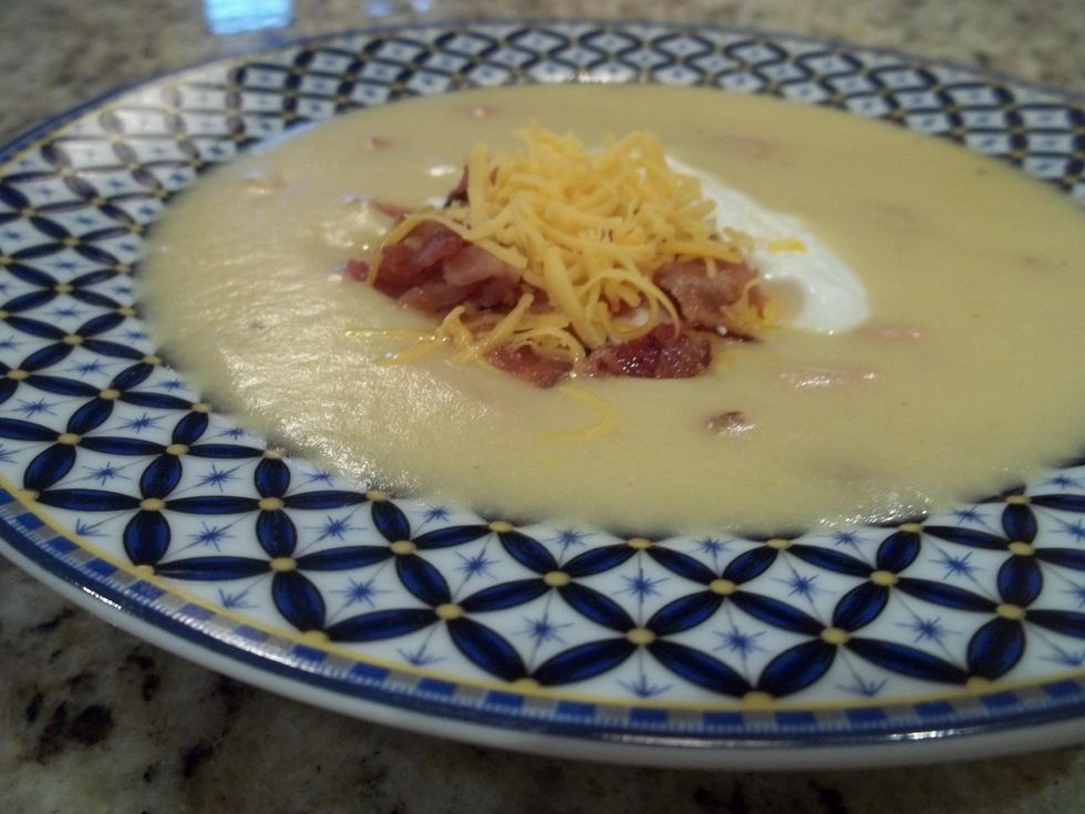 Add the bacon, cheese, green onions, salt and pepper and milk. Bring to a soft boil and then your ready to serve!