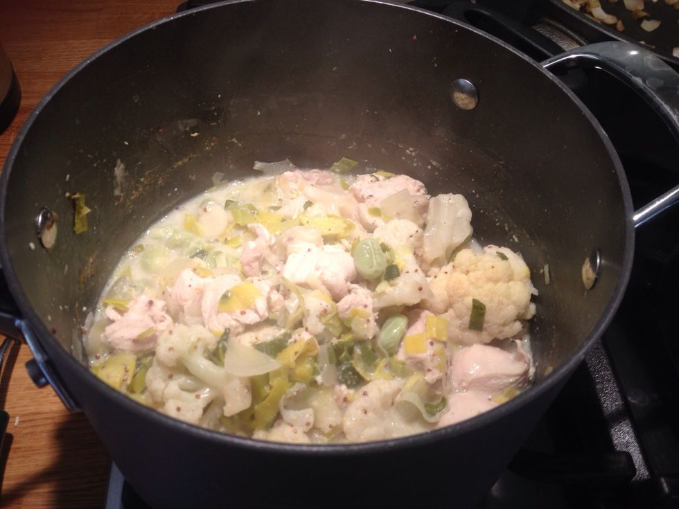 I added some frozen cauliflower and frozen broad beans that I had in. Stir well and cook over a medium heat until the chicken is cooked through and the vegetables are soft