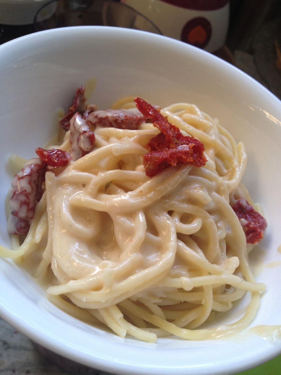 Let the sauce come to a slight simmer then take it off the heat. Put some pasta on the plate and top off with some cream sauce while hot. Enjoy!